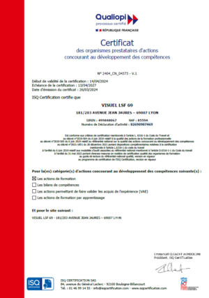 Obtenue en avril 2021, la certification Qualiopi a été délivrée au titre des catégories d’actions concourant au développement des compétences suivantes : les actions de formation.
