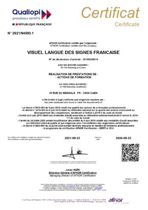 Nous sommes également centre d’examen partenaire avec Visuel-LSF France en vue de l’obtention de la Certification en Langue des Signes Française (CLSF de Visuel LSF France) RS6469 (date de décision : 21-12-2023) pour les niveaux A2 à B2, pour en savoir plus : Fiche RS 6469 sur France Compétences et possibilité de s’inscrire via ce lien :Page Certifications sur le site Visuel-LSF